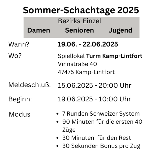 Vom 19.06.2025 bis zum 22.06.2025 fanden zum ersten Mal die Sommer-Schach-Tage des Schachbezirkes Kreis Wesel statt. Der 1. Vorsitzende des …